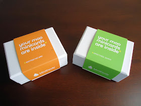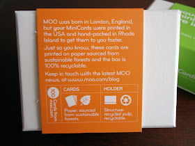They're MiniCards, so they're tiny at only half the size of a standard business card. (70mm x 28mm or 2.75" x 1.10"). I think they're fabulous and I love that the entire rainforest didn't have to die for me to hand my name out to people. The little box they came in is made of recycled pulp and is 100% recyclable so I appreciate that too.