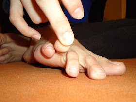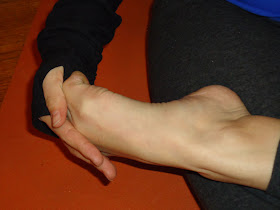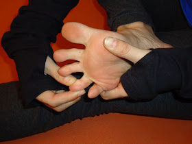 Squeeze your fingers in between all your toes (like so). It'll be a lot like using toe separators, but more intense if you have thick fingers. If your toes are really strong/flexible and are used to spreading all the time - they will not be the least bit impressed by this, but do it anyway. Now rotate your hand/toes in little circles... clockwise and counter-clockwise.  Then bend your toes straight back. Only as far as is comfortable.